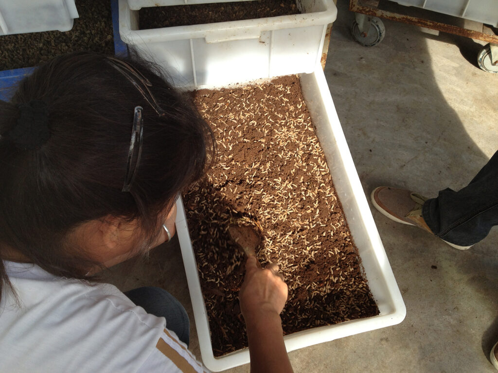 From Article: Figure 1. A caretaker stirs a tray of larvae in a Guangzhou field research station. Photo by Amy Zhang.