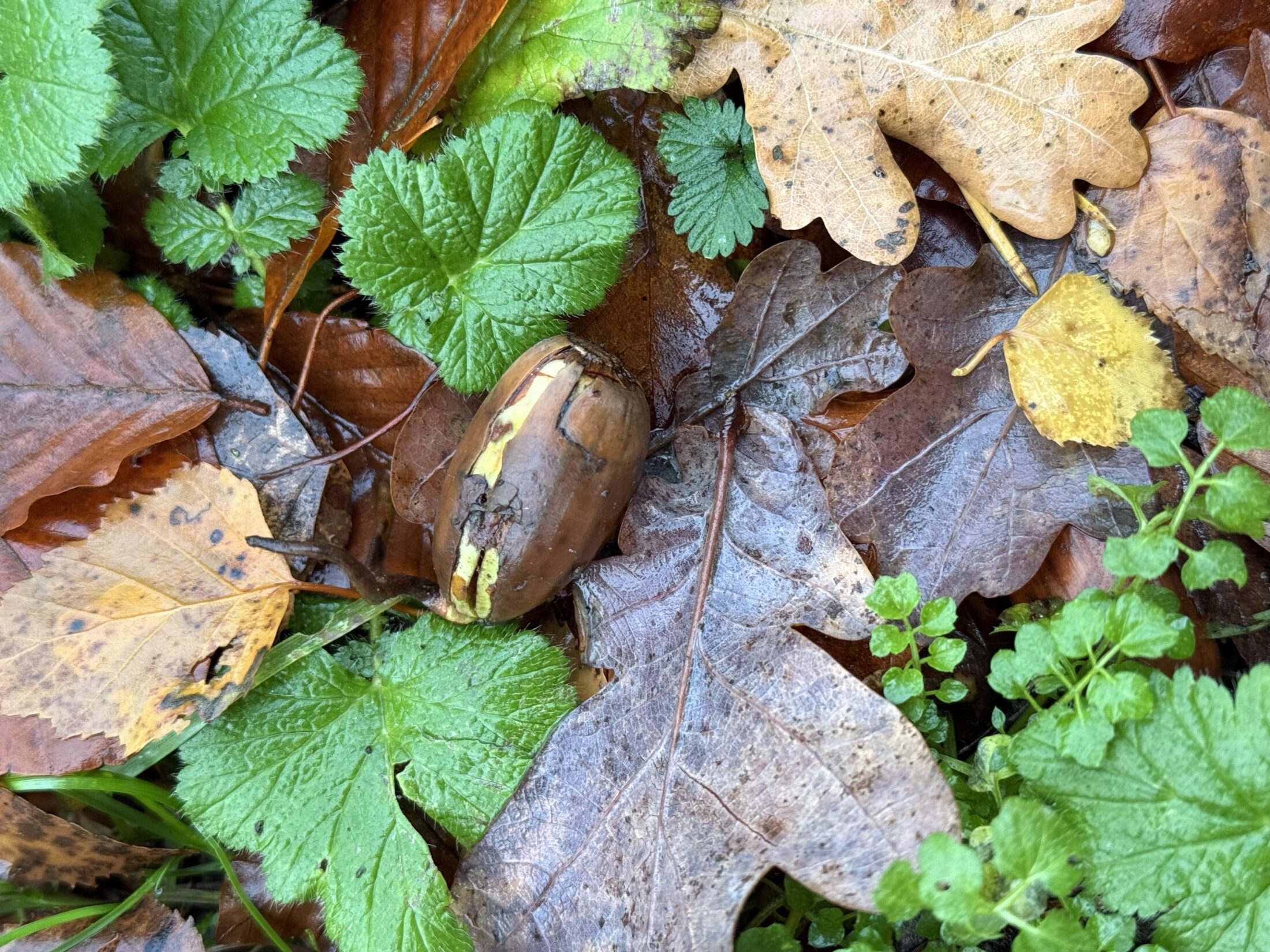 In the familiar place, I could no longer find the acorns. They were covered by fallen leaves. Curious, I lifted the leaves and found they were growing well. I learned that red acorns need to experience a cold period to activate germination, but they cannot be frozen. So fallen leaves became their blanket.I covered them back up and did not disturb them.