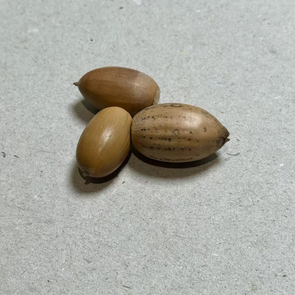Table: dry and faded. The unsealed acorns on the table clearly looked less fresh. Water loss was obvious. When I picked them up, they felt lighter. The kernel had separated from the shell, and I could hear it rattling inside.