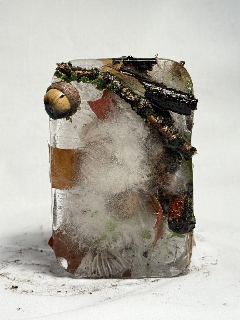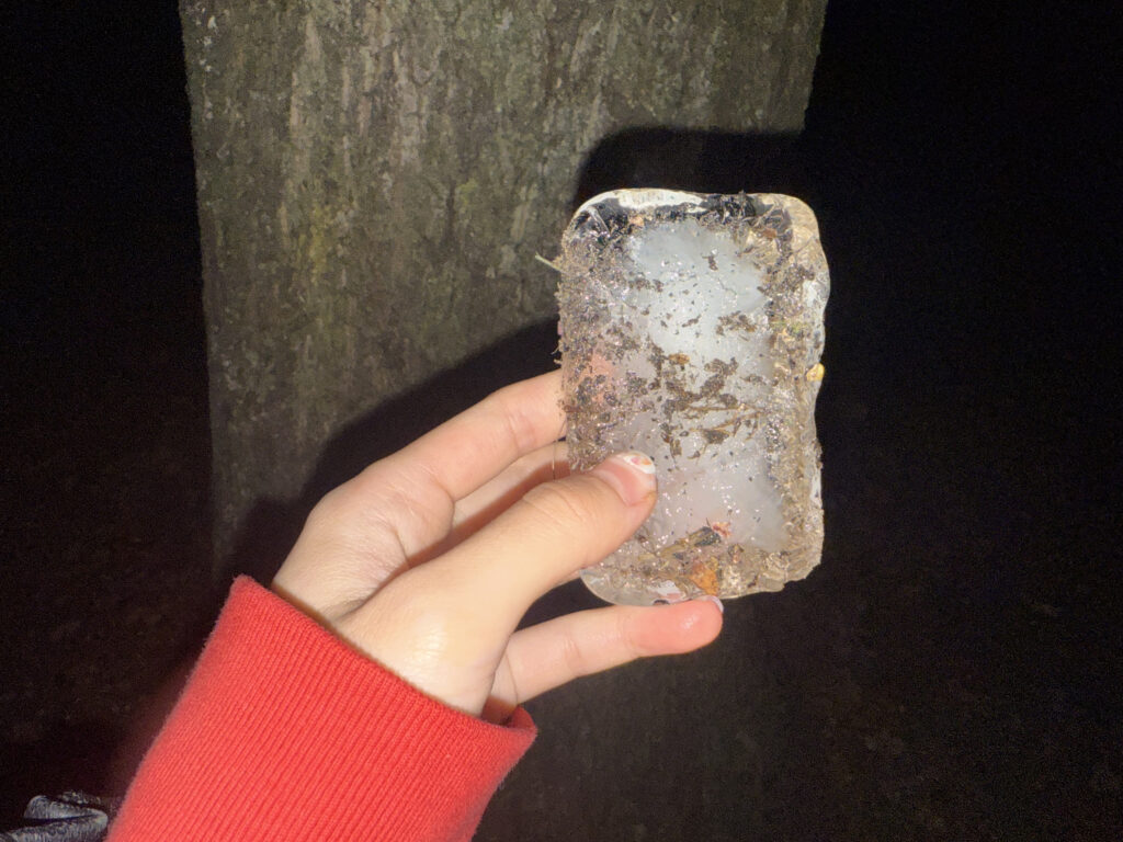 Frozen ice from ice left with evidence of decay found on site
