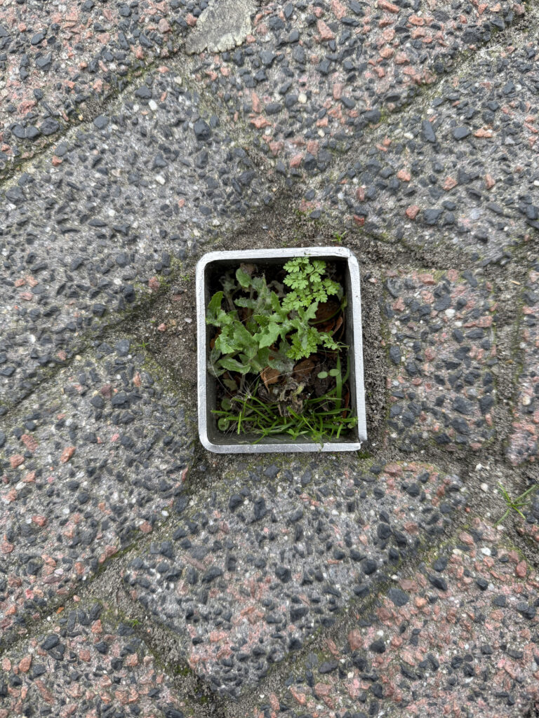 Plant grown inside the metal brick on city's floor
